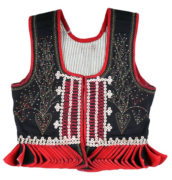 Ważnym elementem ubioru były również gorsety. Starszy typ gorsetu wykonywany był z czarnej tkaniny. Pas uzupełniało kilkadziesiąt (około siedemdziesięciu) trapezowych kaletek, uszytych z tego samego materiału. Ozdabiano je białymi guzikami i haftem tylko z przodu. Późniejszy typ gorsetu (z XIX i XX wieku) wykonywany był z aksamitu o różnych kolorach. Kaletki zostały zastąpione serią plis. Ozdoby pokrywały prawie cały gorset i były wykonane z cekinów, kolorowych koralików, frędzli, wstążek i kolorowych haftów. Ten typ gorsetu z haftowanymi rękawami nazywany był kataną i był najpopularniejszym kaftanem w tym regionie. W chłodne dni na ramiona i plecy zakładano duże chusty w czerwoną, białą, niebieską i zieloną kratę, zwane też naramiennymi.
